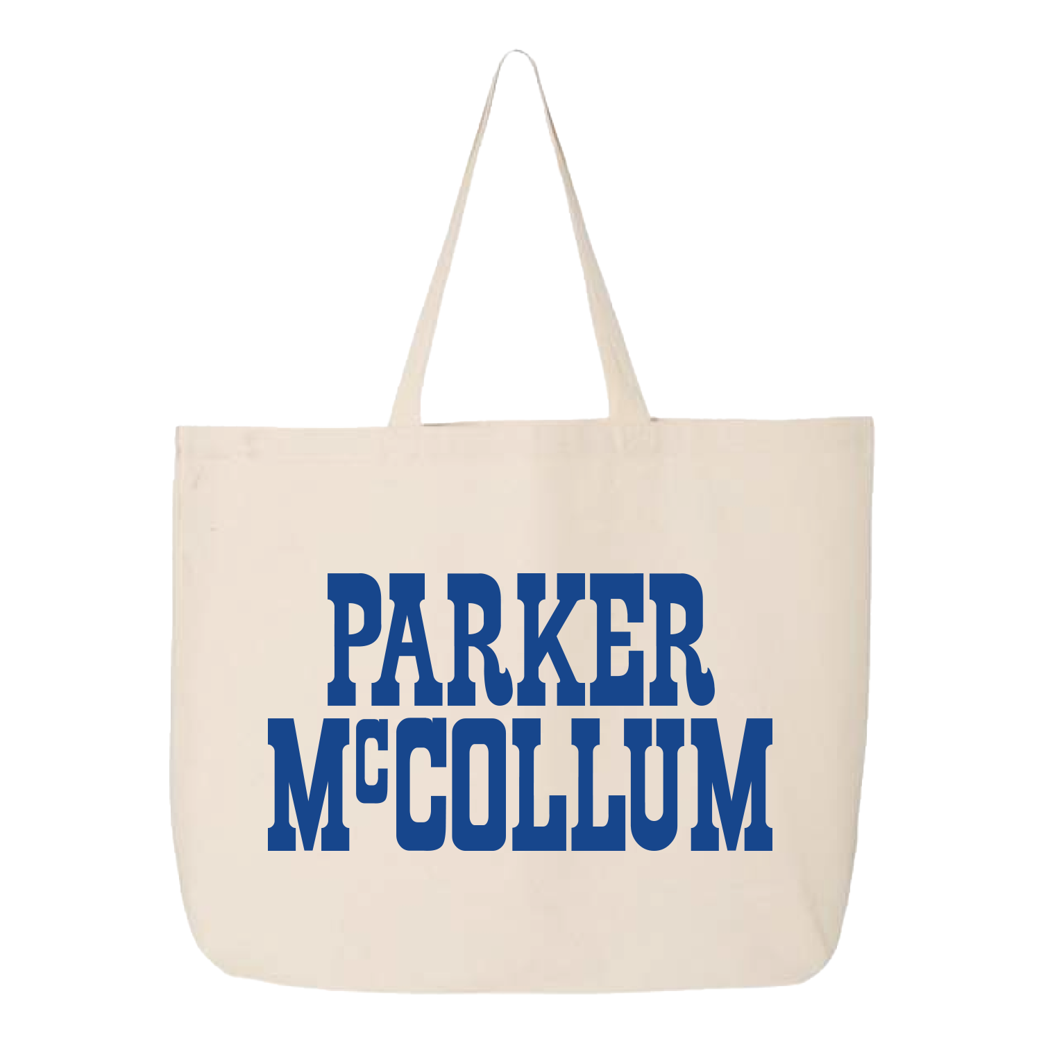 Sreen printed on a 12 oz. 100% cotton jumbo tote bag. 23" canvas webbed handles, 10" handle drop with a bottom gusset.